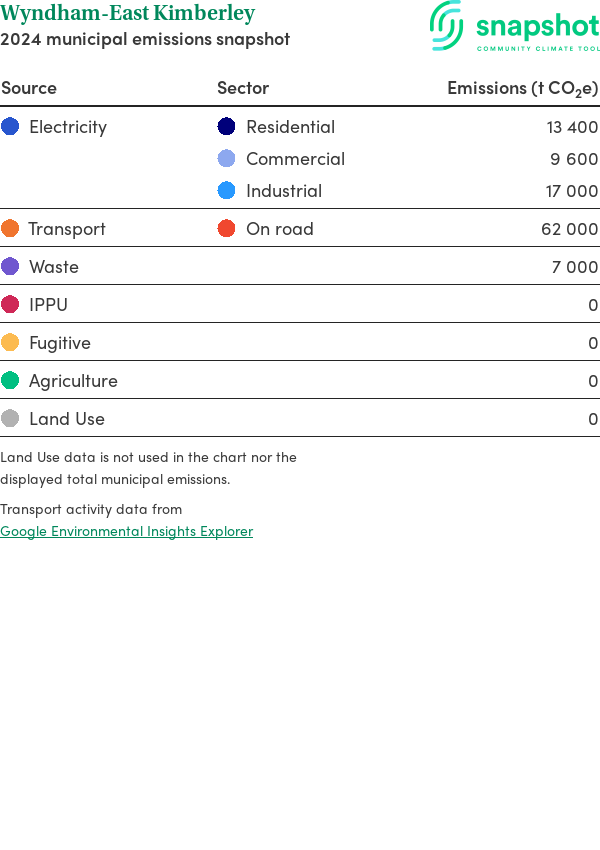 This report outlines the major sources of carbon emissions for the entire region (municipality, electorate, or state). Due to the approximate nature of the profile, the emission values are represented as rounded numbers. This report includes the following sources: