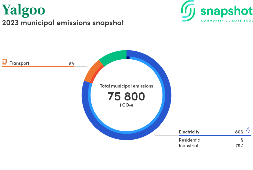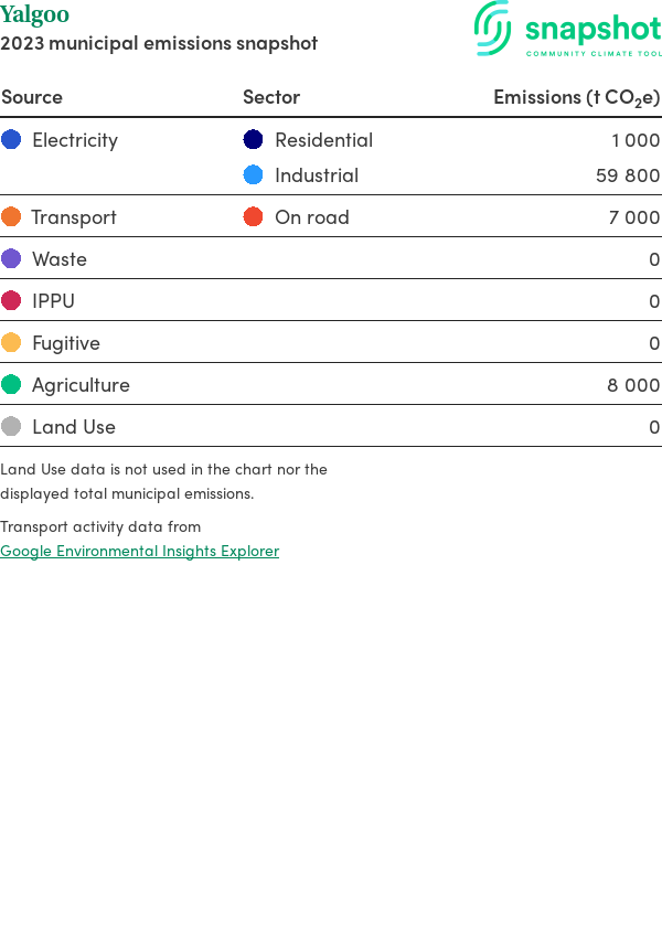 Yalgoo is a rural municipality that is large in geographical area relative to the state average and has a very low urban density. Its major emissions source is electricity consumption with the majority of this coming from industrial electricity consumption.