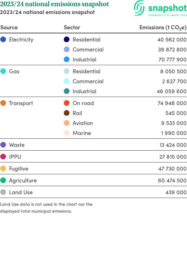 This report outlines the major sources of carbon emissions for the entire region (municipality, electorate, or state). Due to the approximate nature of the profile, the emission values are represented as rounded numbers. This report includes the following sources: