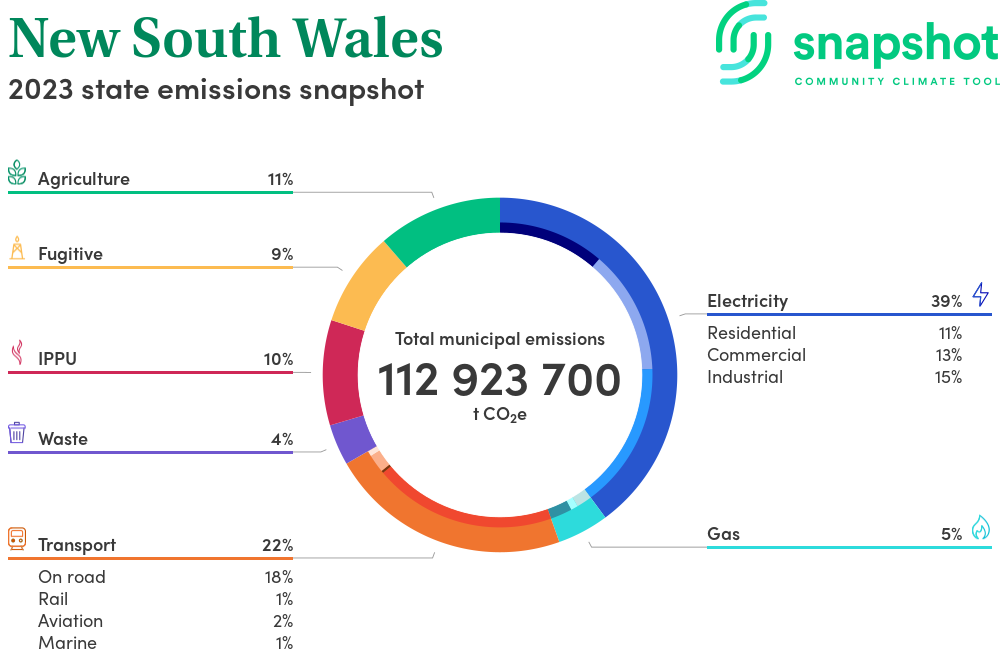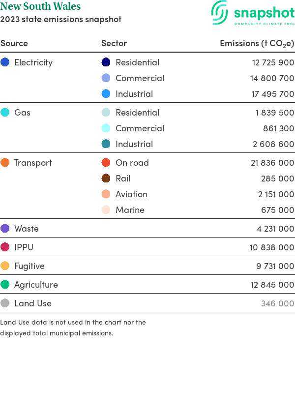 New South Wales is a state that is moderate in size relative to the national average and has a high urban density. Its major emissions source is electricity consumption, due to the state’s scale of population and commercial activity. The second largest source of emissions is gas consumption.