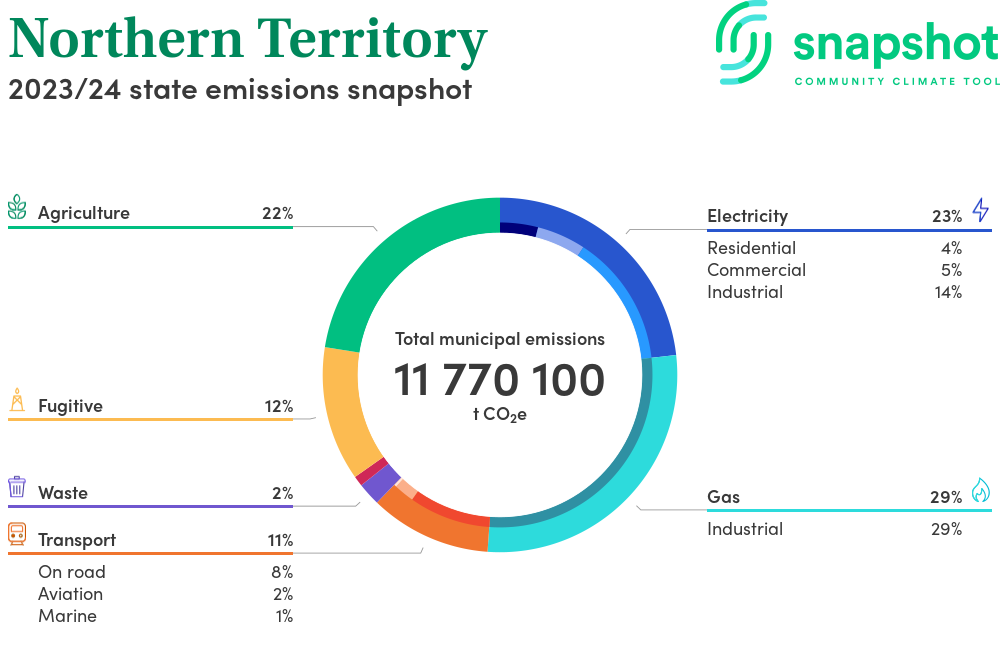 Northern Territory is a territory that is large in geographical area relative to the national average and has a very low urban density. Its major emissions source is electricity consumption with the majority of this coming from industrial electricity consumption.