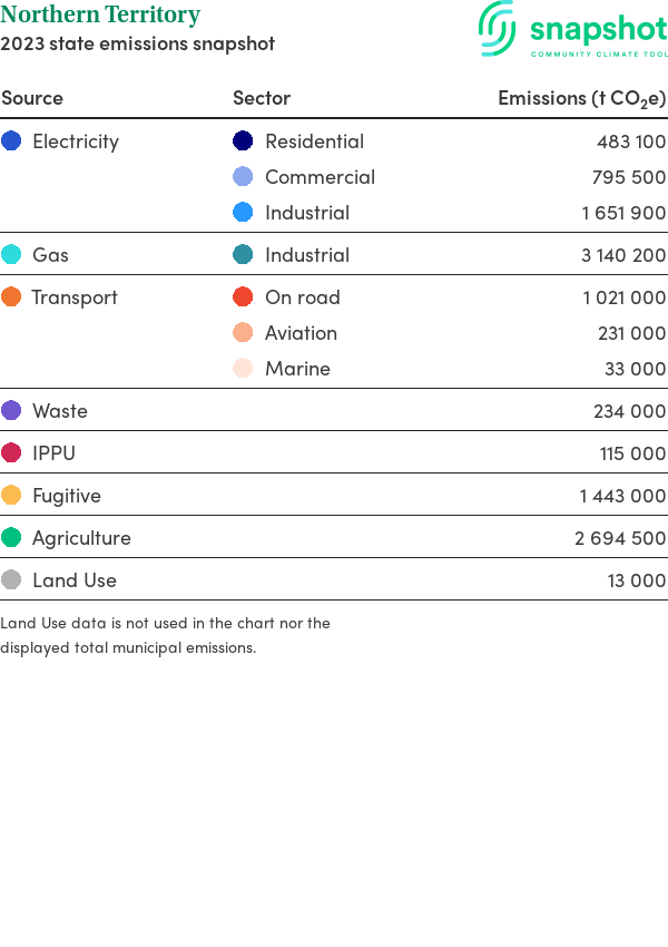 Northern Territory is a territory that is large in geographical area relative to the national average and has a very low urban density. Its major emissions source is electricity consumption with the majority of this coming from industrial electricity consumption.